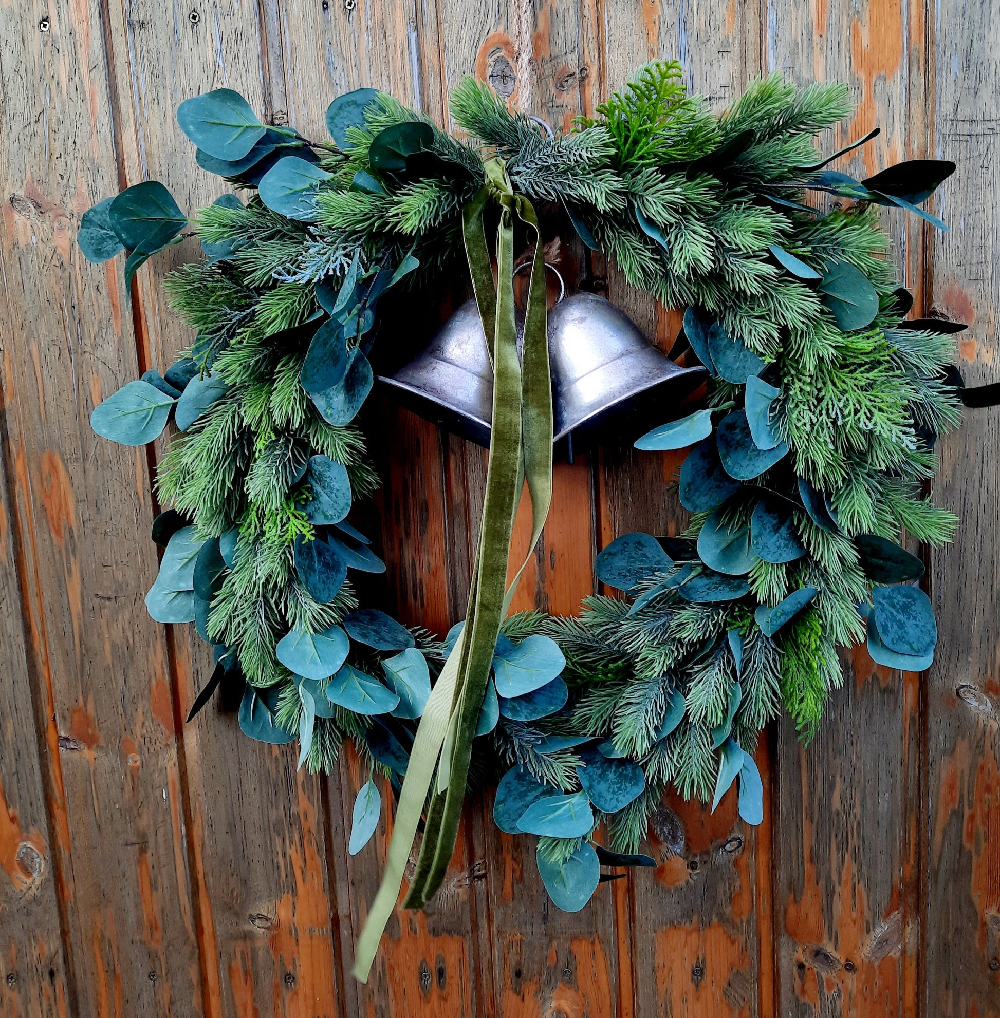 Antique silver bell (if you like, we can blow gold on it), decoration tied to a hoop. Ashy pines, eucalyptus, thuja leaves.